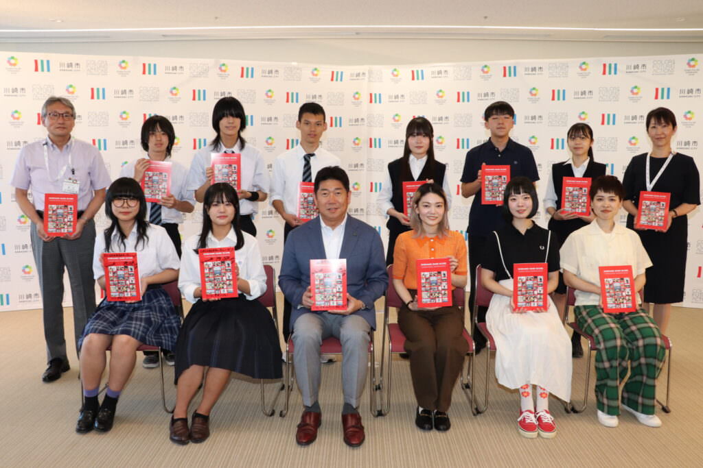 これに先立ち、7月28日にSHISHAMOと市長が、市内学校を代表して川崎市立高津高等学校と神奈川県立川崎高等学校の軽音楽部の生徒たちにバンドスコアを手渡しました。