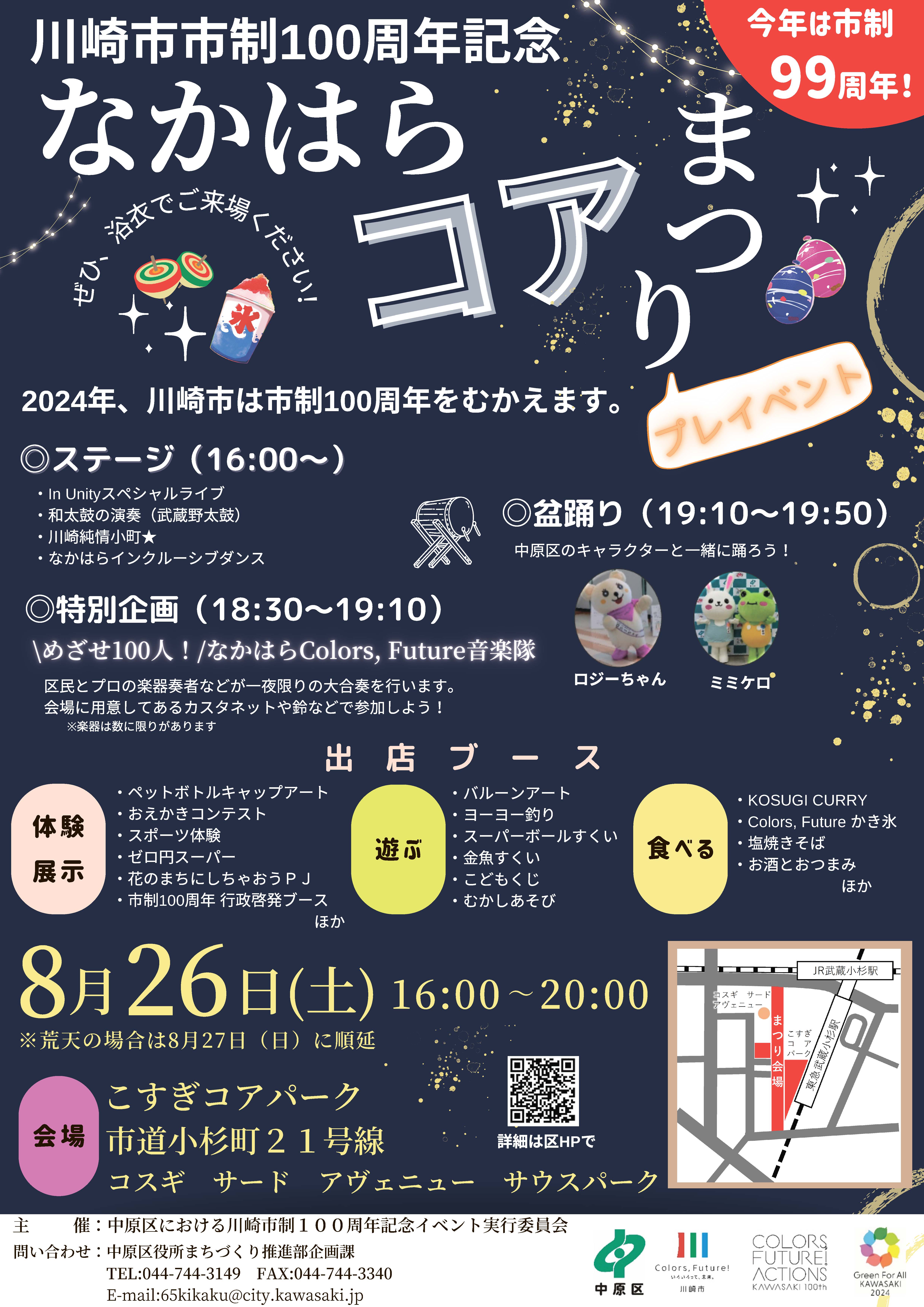 8月17日(木)14時から放送された、かわさきFM(79.1MHz)の「コスギスイッチON!」にて、8月26日(土)に開催する川崎市市制100周年記念プレ事業「なかはらコアまつり」の紹介と告知を行いました!