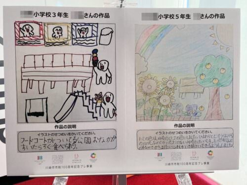 本展示は2024年に迎える市制100周年記念事業及び全国都市緑化かわさきフェアの開催に向けた「市制100周年記念プレ事業」として行われたもので、小学生が描いたイラストから2点、東海道川崎宿を題材とした浮世絵1点が展示されました。区内小学校児童のイラストは「10年後のかわさきのまちに、こんな公園があったらいいな!」をテーマに募集したものです。