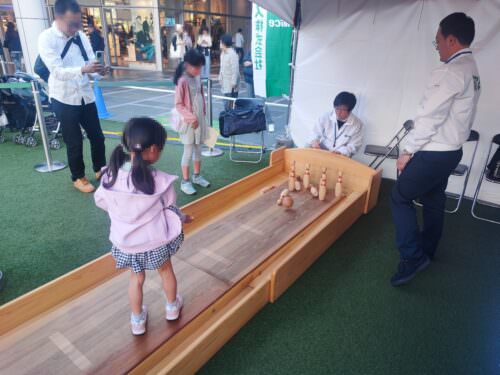 ナイス株式会社のブースでは木製のボーリングで遊ぶことができました。子どもたちに人気のブースで、何人も並んだ列ができていました。