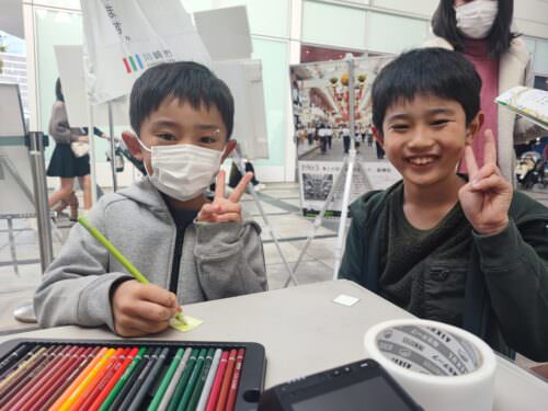 川崎市市制100周年記念事業ブースでは、思い思いの色でカードを塗ってもらい作品を作るワークショップを実施しました。