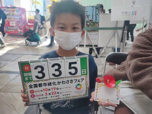 全国都市緑化かわさきフェア実行委員会ブースでは、椿の花をかたどったペーパークラフトが行われました。