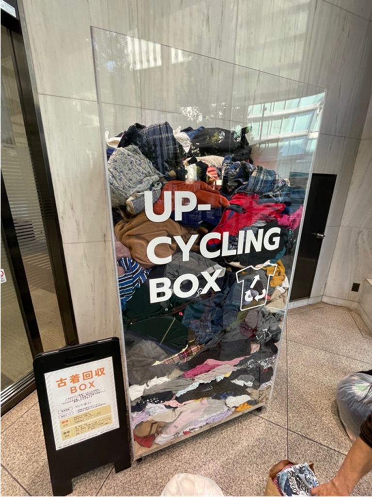 川崎信用金庫本店に1か月間、古着回収BOXを設置いただき、古着を回収しました。回収した古着は、ガーランドなどの会場の装飾にしたり、圧縮して固めて椅子にするなど、アップサイクルするためです。