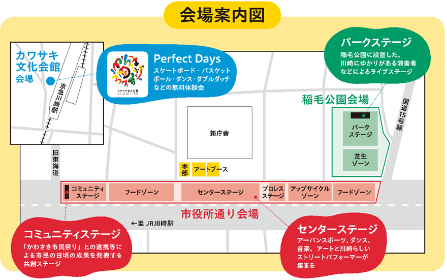 交通規制した市役所通りの車道上、稲毛公園、カワサキ文化会館の3つの会場において、川崎を好きになるきっかけとするイベントを開催しました。