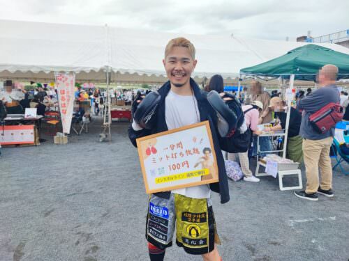 ミット打ち放題体験で皆さん汗だくです