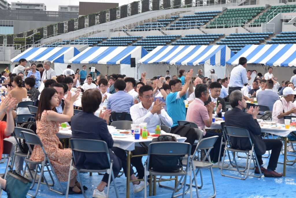 そんな業界をけん引するレゾナックですが、地域交流や社会貢献にも重きを置いています。その一つが、富士通スタジアムで毎年夏に開催している『納涼祭』。特に今年は、市制100周年にあわせ、「レゾナックかわさきマルシェ」と銘打ち、盛大に開催!川崎発祥の大川食堂の「三角おむすび」や、川崎生まれの唐辛子「香辛子」を使い美遊JAPANが開発した商品などの直売会、地元の子育てママが集う「川崎区盛り上げ隊!」によるワークショップ、各種ゲームや抽選会などの子ども向けイベントも数多く企画され、会場に集まった社員や家族、地元町内会、行政や企業関係者ら約1200人で賑わいをみせました。同社川崎事業所・総務部部長の安藤直人さんは「川崎の良いモノや魅力を多くの人に知ってもらう機会になりましたし、ご参加いただいた皆さんの交流の場としてお力添えできたようで良かった」と振り返り、今後も継続していく考えを示しています。