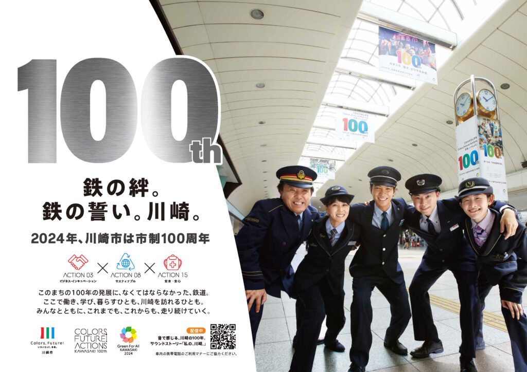 最後はこちら。川崎市内では、旅客鉄道がどれだけ走っているかご存じですか?実は5つの鉄道会社が乗り入れているんです。皆さんの生活に欠かせない鉄道。川崎100年の発展にも、なくてはならないものでした。そして、これからも──。