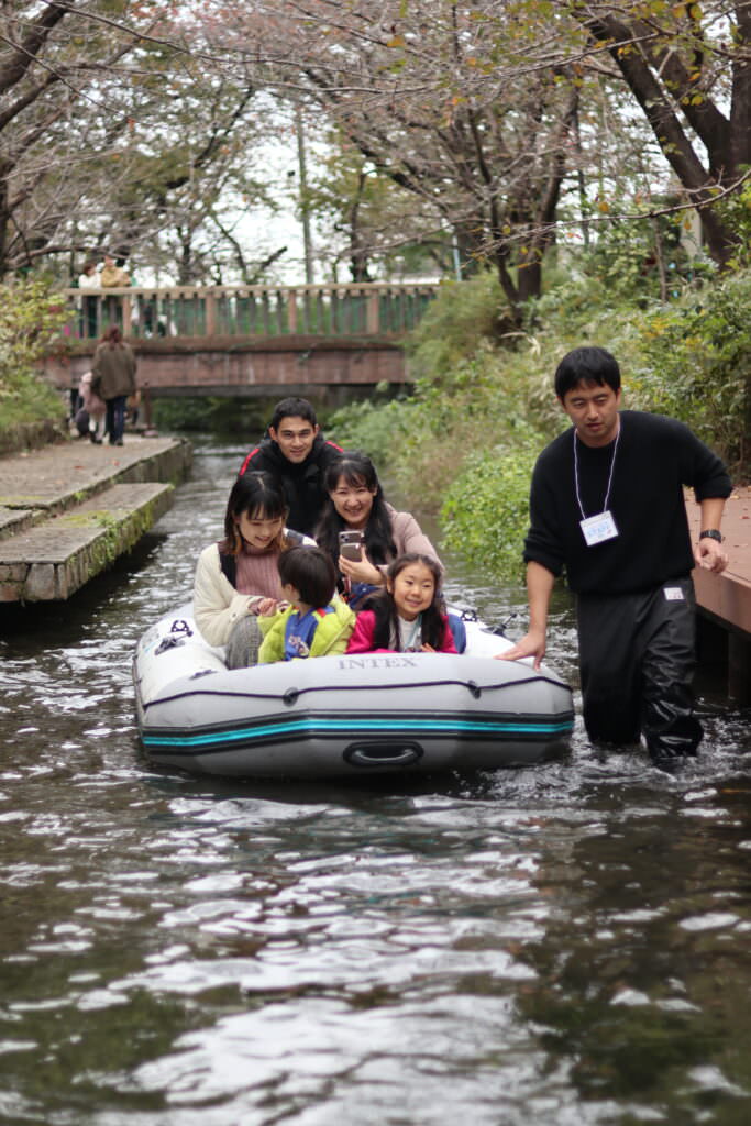 船頭を務めた川崎市建設緑政局河川課の職員による二ヶ領用水が約400年前に人工水路として掘られたこと、二ヶ領用水に沿って町や村が発展し、川崎市が形作られたことなどの解説を聞きながら、二ヶ領用水の歴史や文化に思いを馳せ、ゆったりとした川下りを楽しんでいただきました。