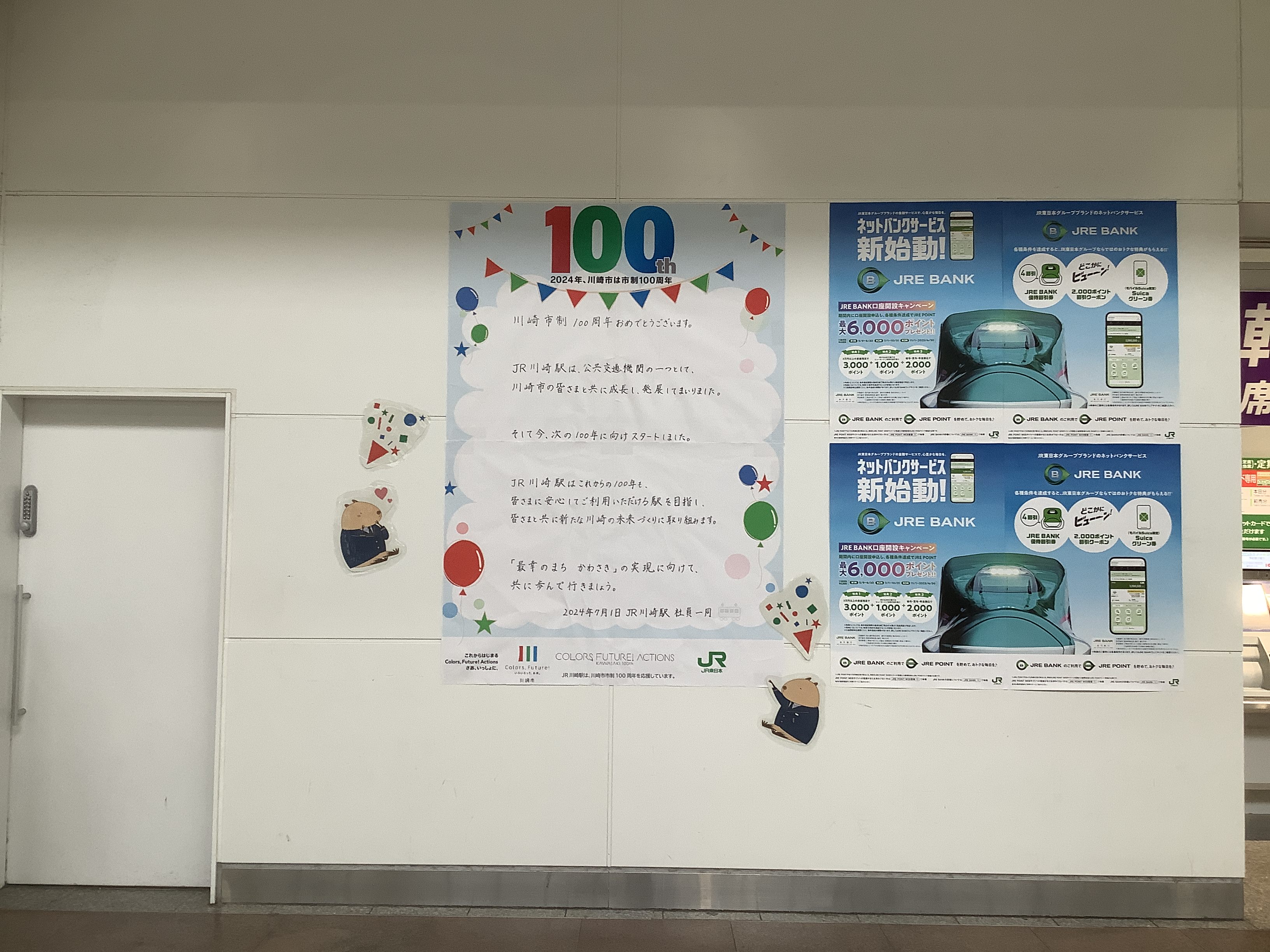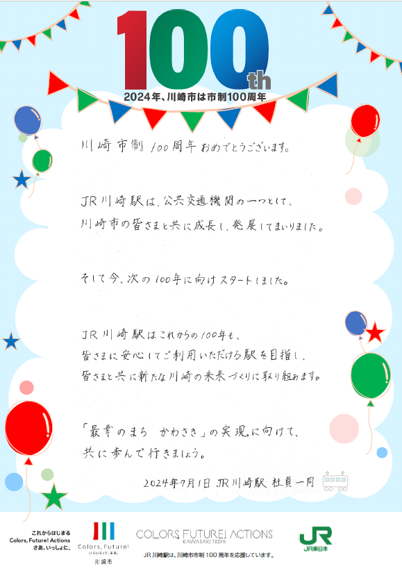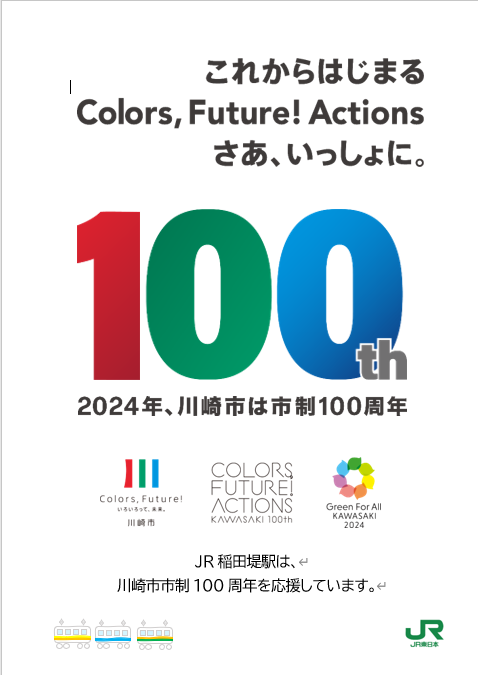 JR東日本は川崎市市制100周年を記念して、南武線沿線の各駅に、川崎市市制100周年のポスターを掲出いたしました。各駅ごとに駅名を変えています。