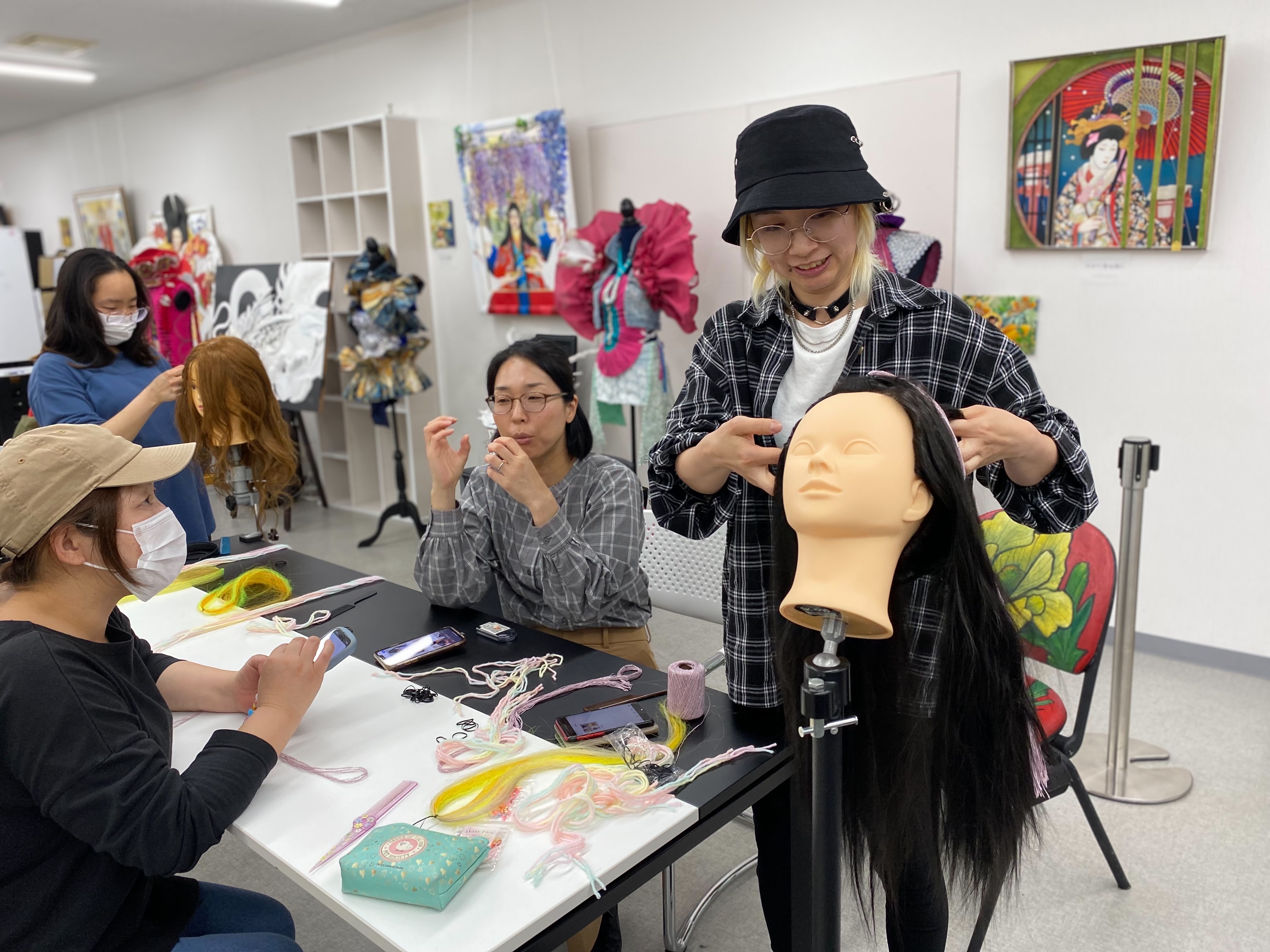 また、編み込みはエクステではなく、100円均一で購入できる毛糸で応用。毛量に合わせて編み込み練習をした。