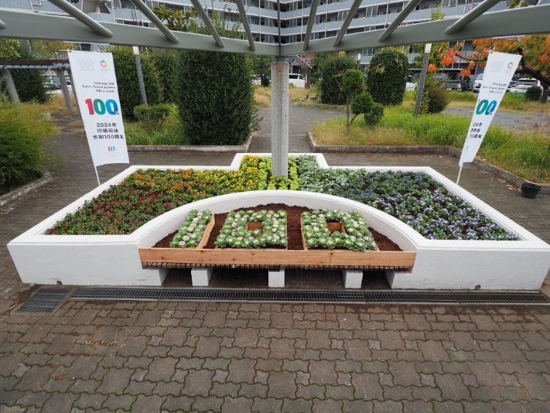 花壇の外側は「全国都市緑化かわさきフェア」のシンボルマークのカラーをイメージして「ビオラ」と「ヒューケラ」を植えました。また、中央は市制100周年を記念して100の文字を「ミニハボタン」でデザインしました。
