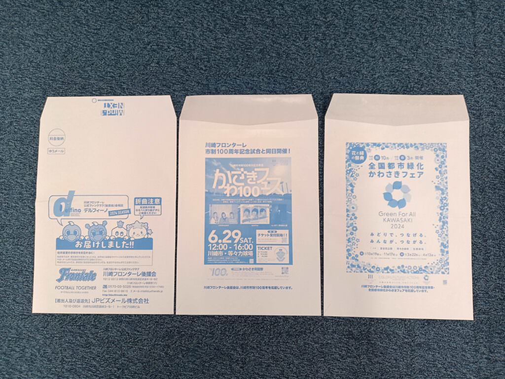 川崎フロンターレ後援会では、後援会会員(会員数約5万人)向けの会報誌『Delfino(デルフィーノ)』(1シーズン中6回)を発行していますが、川崎市外在住の会員も含め、より多くの方に川崎市が市制100周年を迎えることをはじめ、『かわさき100フェス』や『全国都市緑化かわさきフェア(4/13まで開催)』などの記念イベント開催などを周知するため、市制100周年を迎える前年から計8回にわたり、会報誌を郵送する封筒の裏面全面を使って広報を行い、お祝いムードを盛り上げました。