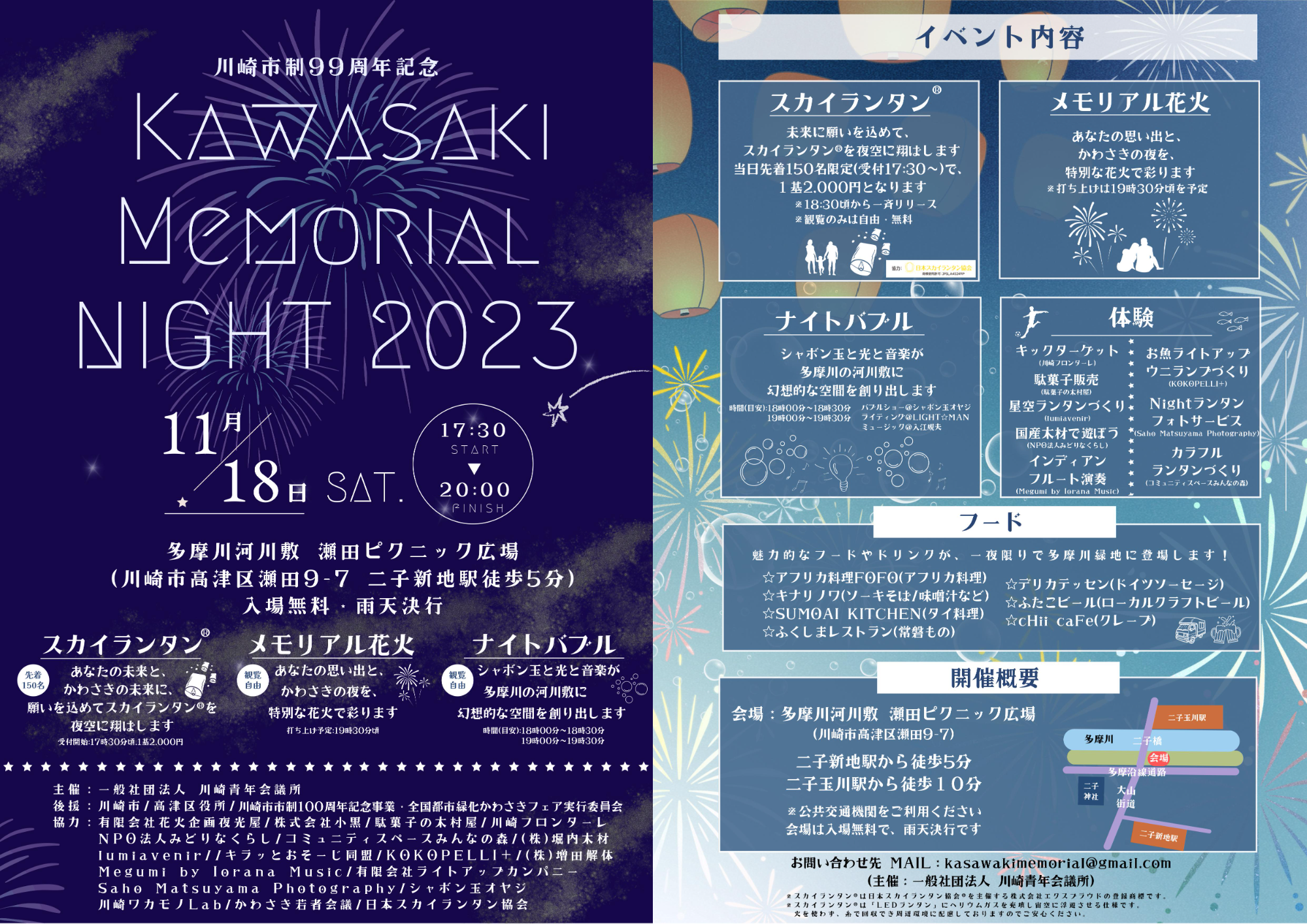 川崎市制99周年を記念して、"川崎の夜を彩る"というコンセプトのもと、花火やスカイランタン、ナイトバブルショー等を行います!