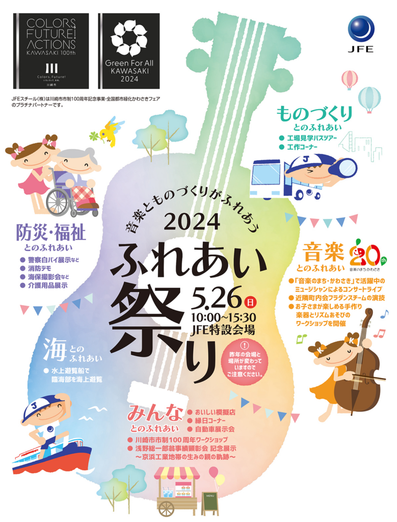 「音楽」「ものづくり」「海」「防災・福祉」とのふれあいをテーマに、「音楽のまち・かわさき」で活躍するアーティストのライブや近隣地域町内会団体の演奏・演技、お子様が楽しめる手作り楽器とリズムあそびのワークショップ、自動車展示、警察白バイ展示・消防デモンストレーション・海上保安署制服撮影、工場見学ツアー、臨海部ミニクルーズ、川崎市市制100周年ワークショップ、浅野総一郎翁事績顕彰会記念展示を行います。ほかにもおいしい模擬店や縁日コーナー、工作コーナーもご用意しています。