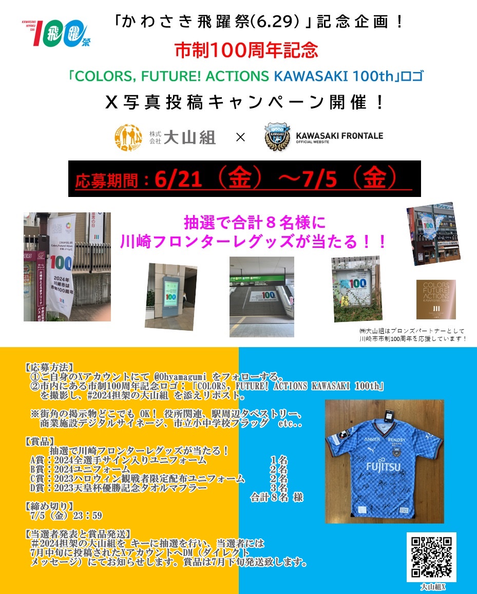 ②市内にある市制100周年記念ロゴ:「COLORS, FUTURE! ACTIONS KAWASAKI 100th」を撮影し、#2024担架の大山組 を添えリポスト。