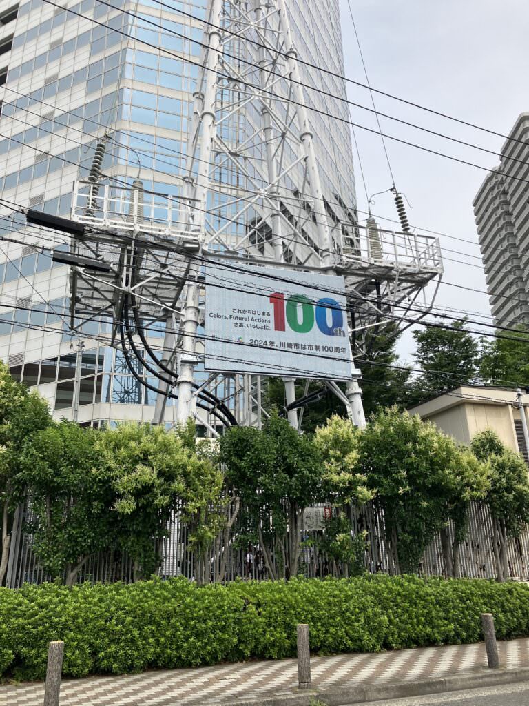 このたび川崎市幸区鹿島田にある送電鉄塔にデジタルサイネージを設置し、川崎市市制100周年のPR動画を、川崎市と東京電力パワーグリッド株式会社川崎支社、東電設計株式会社、株式会社Drootsが連携し作成の上、放映することになりました。