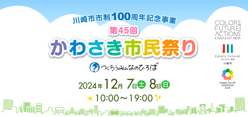 「つくろう みんなのひろば」を合言葉に、川崎を広く内外に誇れるものとし、より豊かな市民文化の創造と地域経済の活性化を推進するとともに、本年度は市制100周年記念事業として、市民・事業者・行政が一体となり「かわさき市民祭り」を開催します!