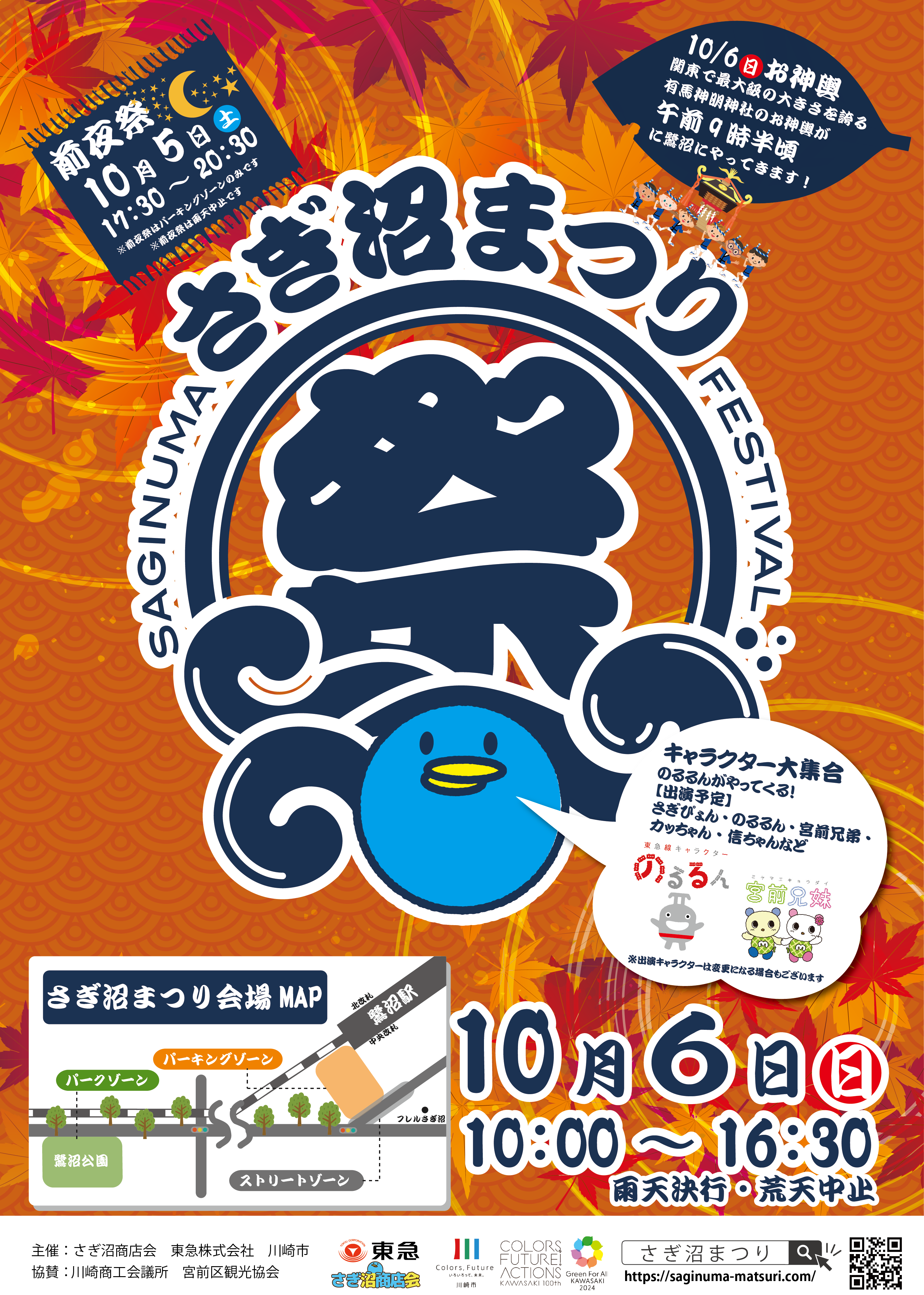 その取組の一環として、昨年度に引き続き、道路等の公共空間を活用した鷺沼エリアの更なる活性化に向けて、川崎市、東急、さぎ沼商店会の3者が連携し、鷺沼駅周辺エリアを周遊しながら楽しめるイベント「さぎ沼まつり」を開催します。