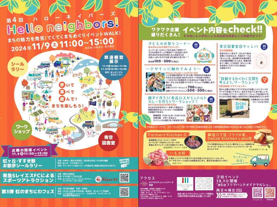 また同エリアで、虹ヶ丘・すすき野お散歩シールラリーや東急SレイエスFCによるスポーツアトラクション・第3弾虹のまちにわフェスなどのイベントも開催されています。