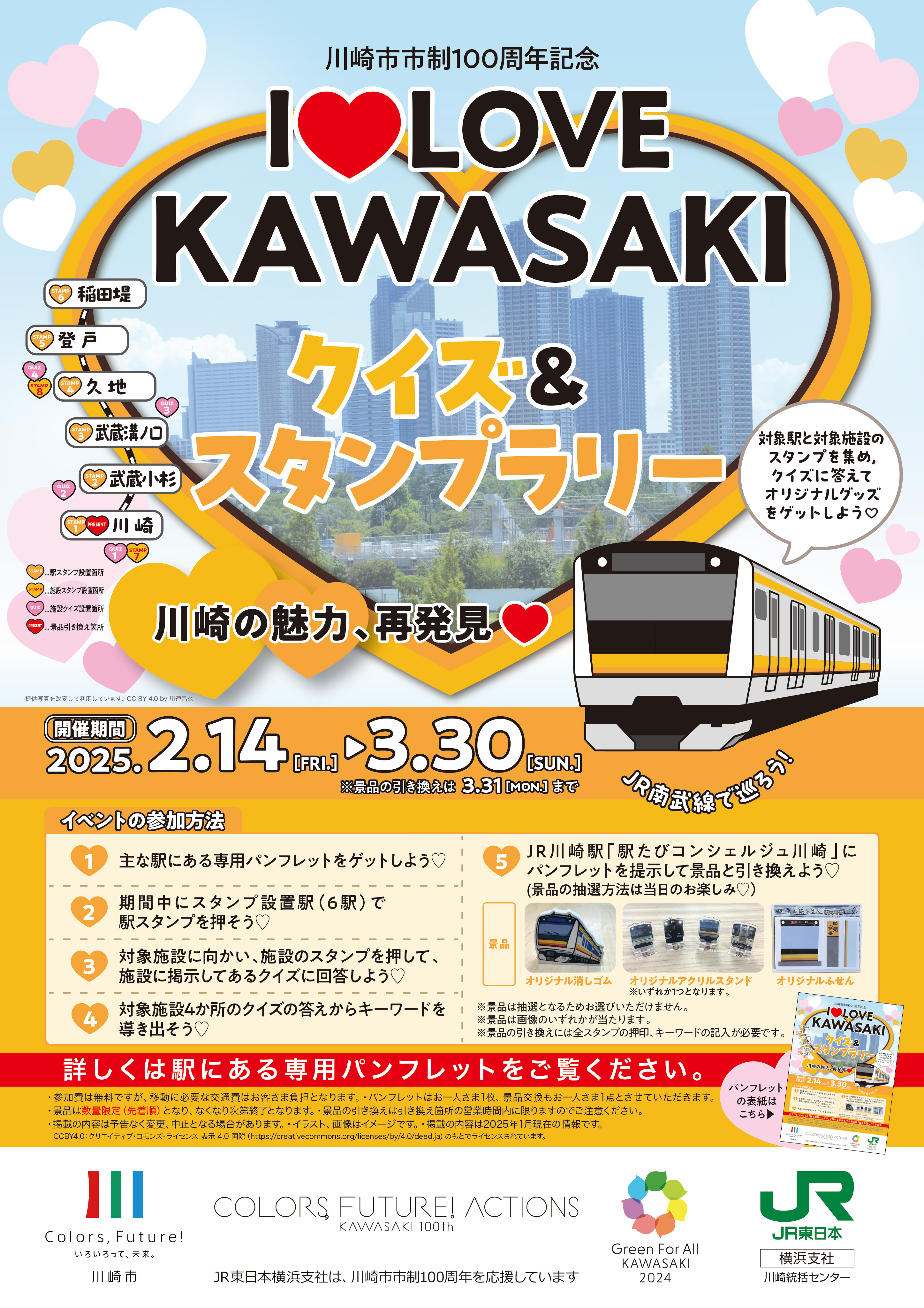 JR東日本横浜支社では、地域の皆さまをはじめ、より多くのお客さまに、川崎市の魅力を再発見してもらうため、川崎市内にある南武線の駅や、地域の歴史を学ぶことができる川崎市内の施設を巡る、クイズ&スタンプラリー「I ❤ LOVE KAWASAKI~川崎の魅力、再発見~」を2月14日から3月30日まで開催します。