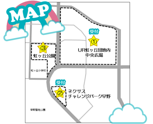 次の100年に向けて、地域の皆さんとまちづくりを考えるきっかけとして、麻生区虹ヶ丘地区及びその周辺の魅力を再発見していただくため、小学生等を対象に、謎解きMAPを片手に地域資源((1)UR虹ヶ丘団地内中央広場、(2)ネクサスチャレンジパーク早野、(3)虹ヶ丘公園)を巡る周遊型の「虹ヶ丘ナゾ解きWALK」を開催します。