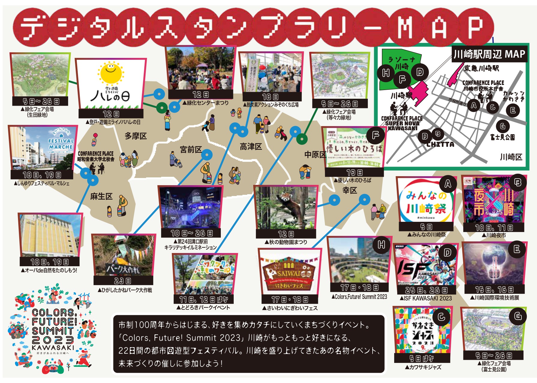 Colors, Future! Summit 2023で実施されている 22日間(11/5~11/26)の都市回遊型フェスティバル。その期間中に川崎市内で同時開催する様々なイベントと連動した、豪華賞品が抽選でもらえるデジタルスタンプラリーが実施されています。