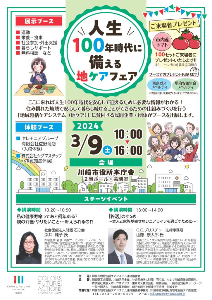 住み慣れた地域で安心して暮らし続けることができるための仕組みづくりを行う「地域包括ケアシステム(地ケア)」に賛同する民間企業・団体「川崎市地域包括ケアシステム連絡協議会」が主催する全く新しいイベントに、ぜひお越しください。参加費無料です。