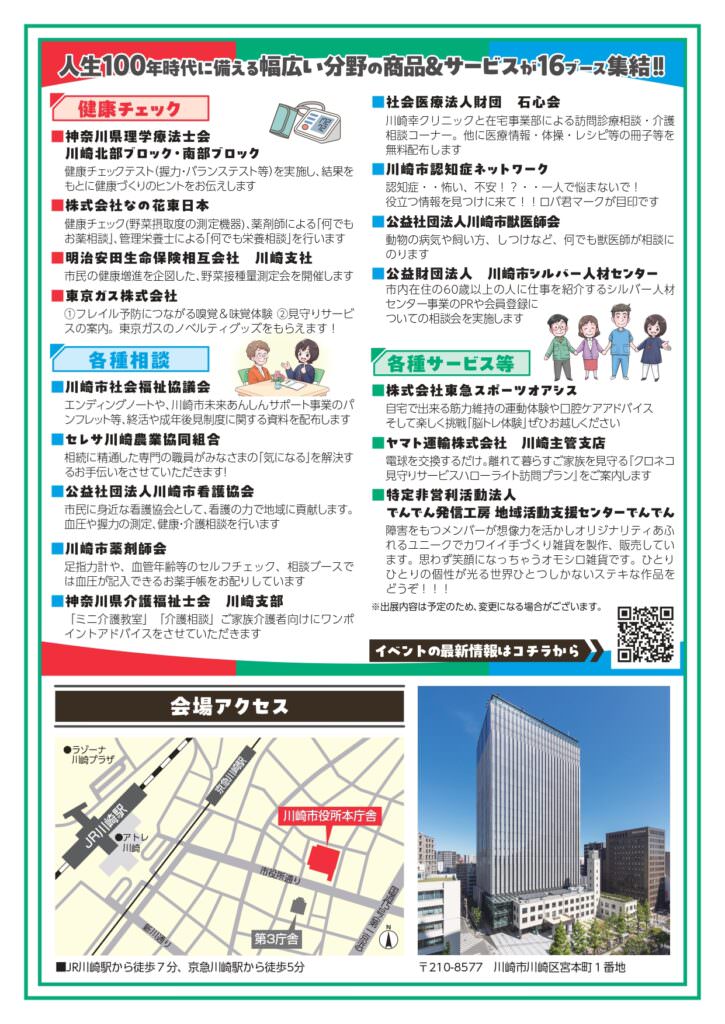 神奈川県理学療法士会 神奈川県理学療法士会 川崎北部ブロック・南部ブロック、株式会社なの花東日本、明治安田生命保険相互会社 川崎支社、東京ガス株式会社、川崎市社会福祉協議会、セレサ川崎農業協同組合、公益社団法人 川崎市看護協会、川崎市薬剤師会、神奈川県介護福祉士会 川崎支部、社会医療法人財団 石心会、川崎市認知症ネットワーク、公益社団法人 川崎市獣医師会、公益財団法人 川崎市シルバー人材センター、株式会社東急スポーツオアシス、ヤマト運輸株式会社 川崎主管支店、特定非営利活動法人 でんでん発信工房 地域活動支援センターでんでん