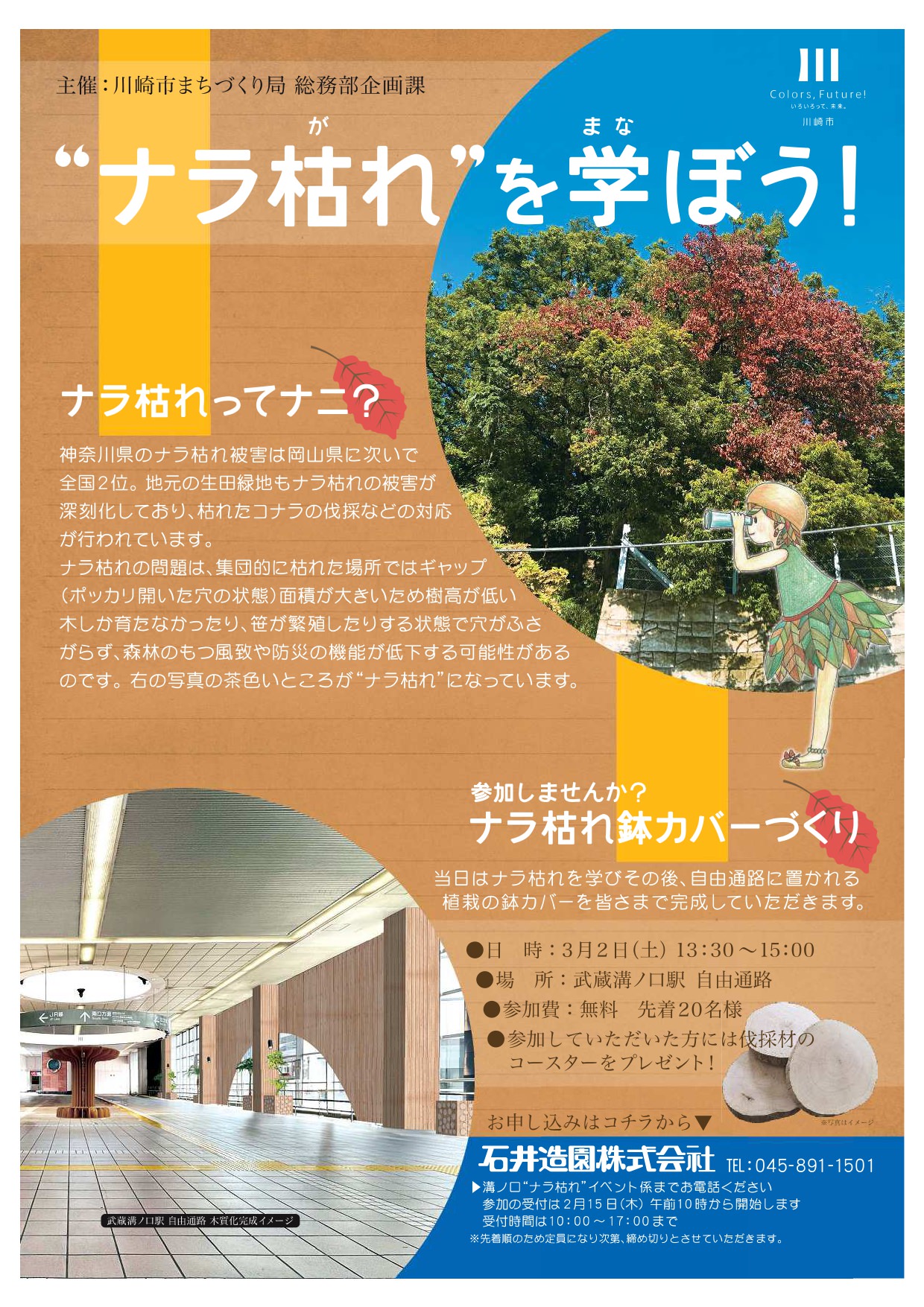 そこで、ナラ枯れ(※)について学ぶとともに、その被害にあった木材を活用して武蔵溝ノ口駅南北自由通路に新たに設置する観葉植物の鉢カバーの仕上げを行うワークショップを開催します。