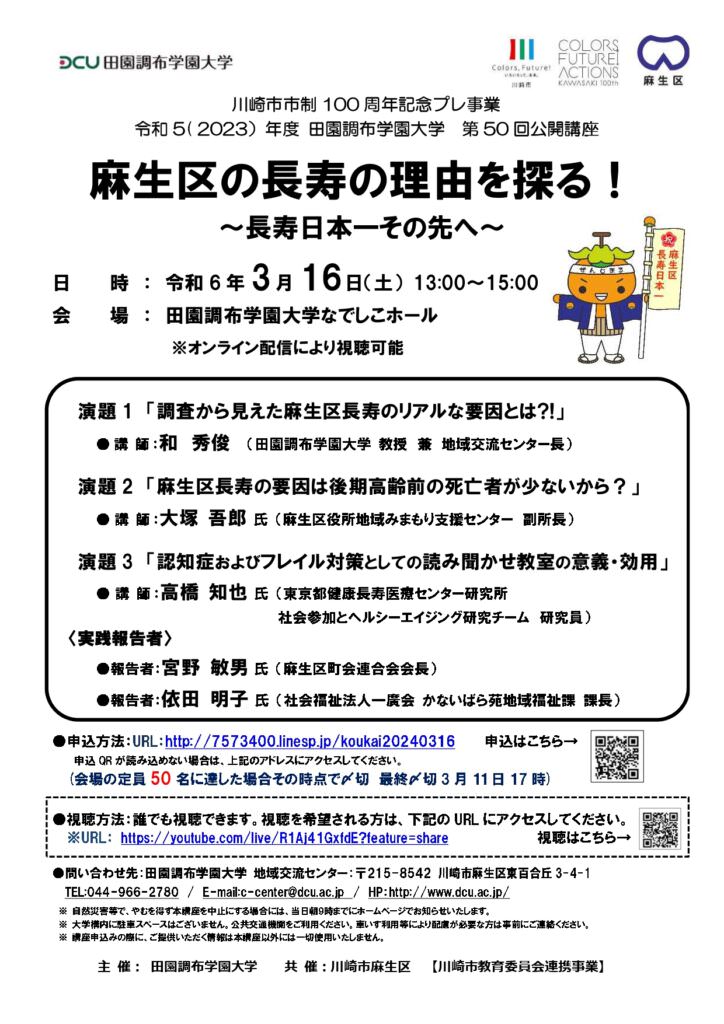 2023年5月12日に厚生労働省が公表した「令和2年市区町村別生命表」では、麻生区は男女ともに平均寿命が全国で最も長くなりました。麻生区役所では、区内にある田園調布学園大学と連携し、3月16日(土)に公開講座を開催します。