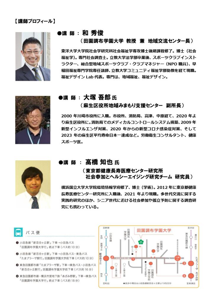 当日は、田園調布学園大学の和(かのう)教授による研究から麻生区民が長寿日本一となった理由を探るとともに、医療や地域活動の観点から、地域において自立した日常生活を営むために各々が取り組むことについてお伝えします。