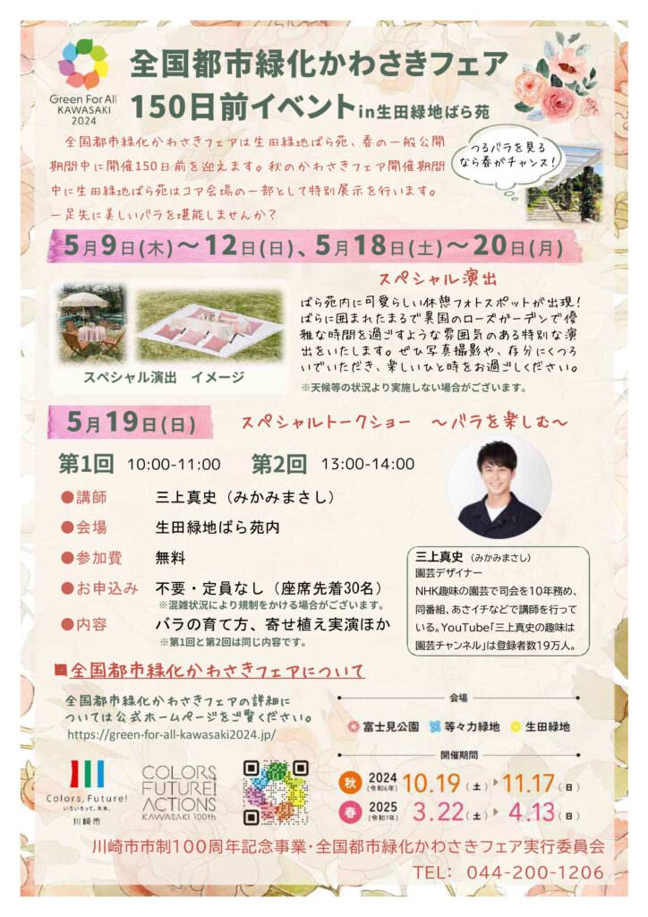 全国都市緑化かわさきフェア 秋開催の150日を前に、コア会場の一部となる生田緑地ばら苑で特別な休憩フォトスポットの設置やトークショーなどのスペシャルなイベントを開催します。