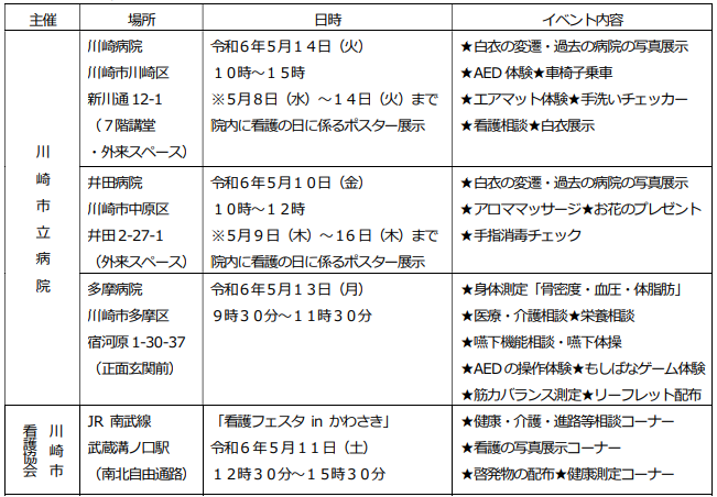 そのため、川崎市立病院及び川崎市看護協会では、看護に関する各種体験、相談等のイベントを開催します。