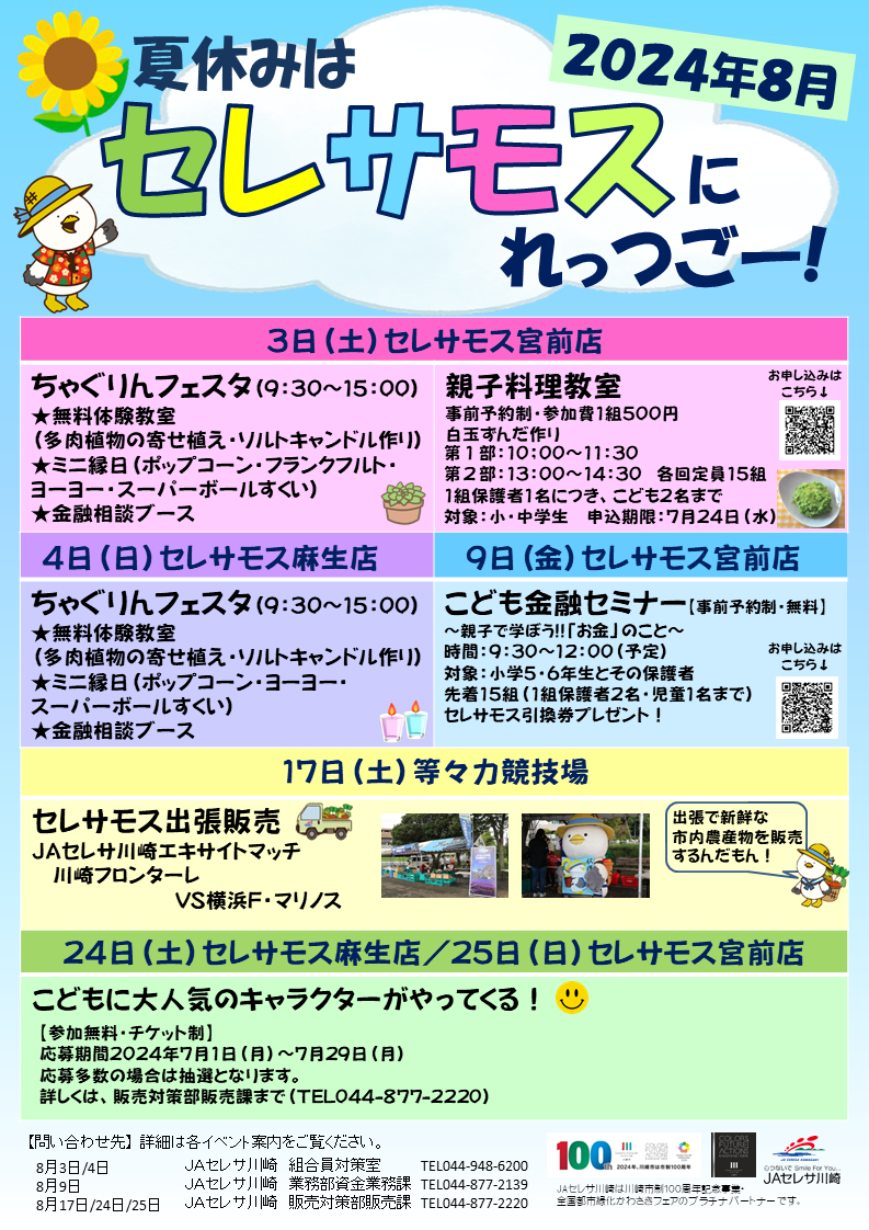 JAセレサ川崎では、8月に「夏休みはセレサモスにれっつごー!」キャンペーンを開催いたします。
