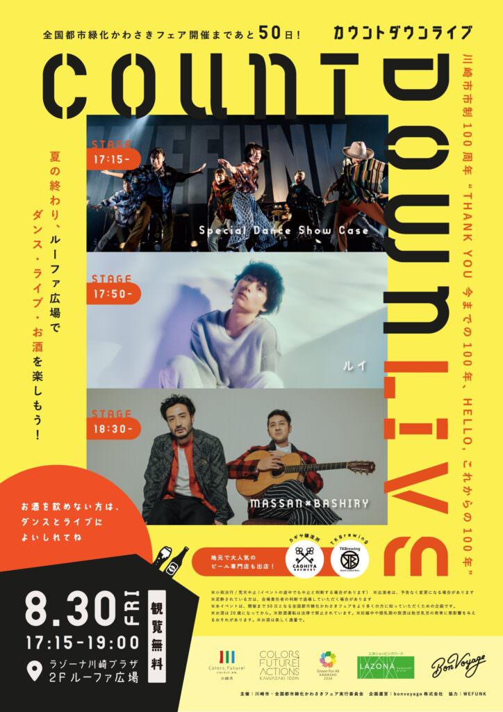 このたび取組の一環として、開催まで 50 日となる全国都市緑化かわさきフェアと連携して、かわさきフェアのまちなかみどりスポット(※)の一つである三井ショッピングパーク ラゾーナ川崎プラザのルーファ広場にて、"COUNT DOWN LIVE"と題し、アーティスト等による歌やダンス、飲食スペース等を提供し、若者を中心に、多くの来場者とともに、市制100 周年を盛り上げ、かわさきフェアに向けた機運醸成を図るイベントを開催します!