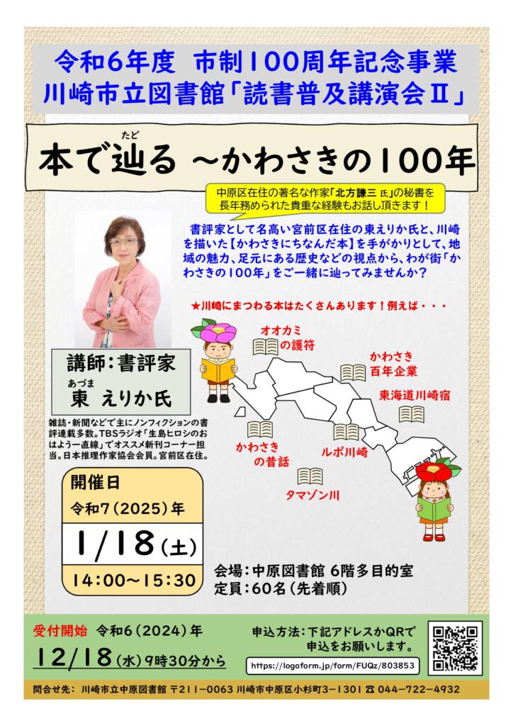 書評家として名高い宮前区在住の東えりか氏と、川崎を描いた【かわさきにちなんだ本】を手がかりとして、地域の魅力、足元にある歴史などの視点から、わが街「かわさきの100年」をご一緒に辿(たど)ってみませんか?