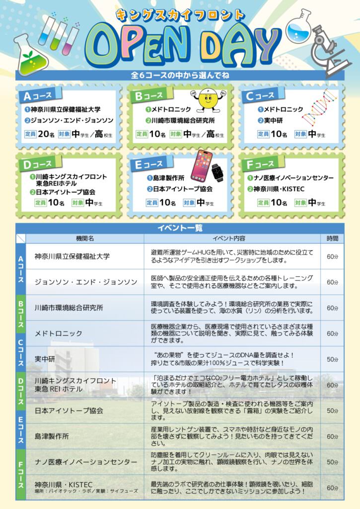健康・医療、環境分野における世界最先端の研究開発エリア「殿町国際戦略拠点キングスカイフロント」で、最先端技術を体験してみよう!実際に医療現場で使われている医療機器に触れたり、防塵服を着てクリーンルームに入ったり、顕微鏡で細胞を見たりする体験型イベントです。
