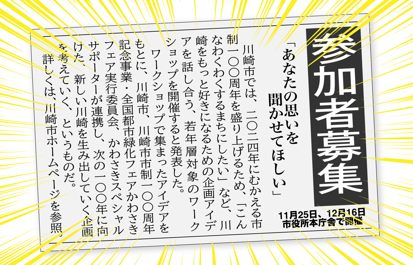 川崎市市制100周年を盛り上げるアイデア出しワークショップの参加者募集中!(11/12まで)