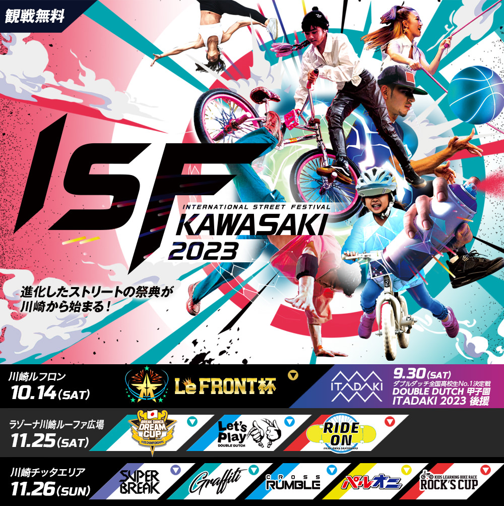 主催者:INTERNATIONAL STREET FESTIVAL KAWASAKI実行委員会 開催日: 2023年10月14日 場 所:10/14川崎ルフロン、11/25ラゾーナ川崎プラザ ルーファ広場 (※雨天時 KAWASAKI BRAVE THUNDERS COURT)、11/26CULB CITTA'・KAWASAKI BRAVE THUNDERS COURT・チネチッタ通り