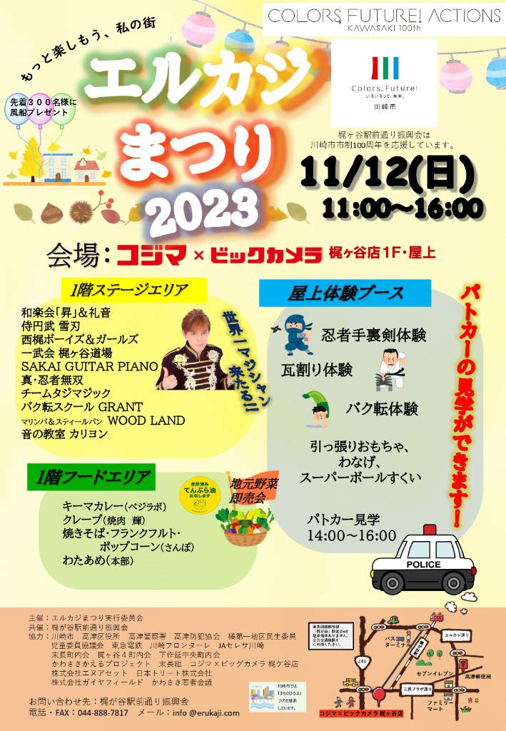 主催者:エルカジまつり実行委員会(梶が谷駅前通り振興会) 開催日: 2023年11月12日 時 間:11:00~16:00 場 所:コジマ×ビックカメラ梶ヶ谷店(東急田園都市線 梶ヶ谷駅)