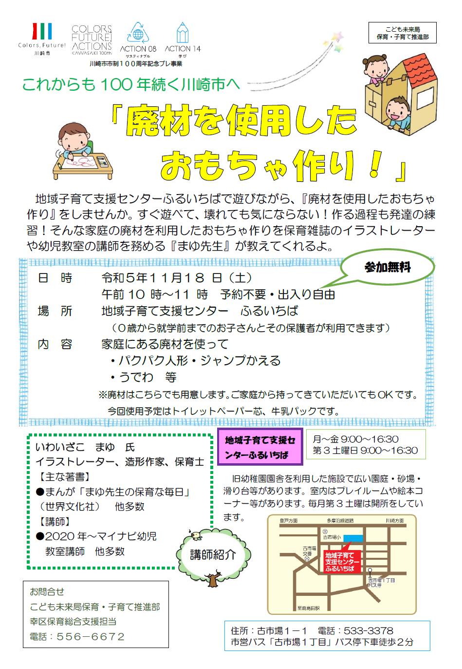 主催者:川崎市 こども未来局 保育・子育て推進部 幸区保育総合支援担当 開催日: 2023年11月18日 時 間:10:00-11:00 場 所:地域子育て支援センターふるいちば(川崎市幸区古市場1-1)