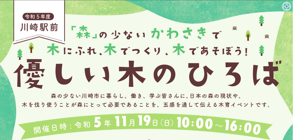 主催者:令和5年度川崎駅前優しい木のひろば実行委員会 開催日: 2023年11月19日 時 間:10:00~16:00 場 所:ラゾーナ川崎プラザ内 ルーファ広場ほか