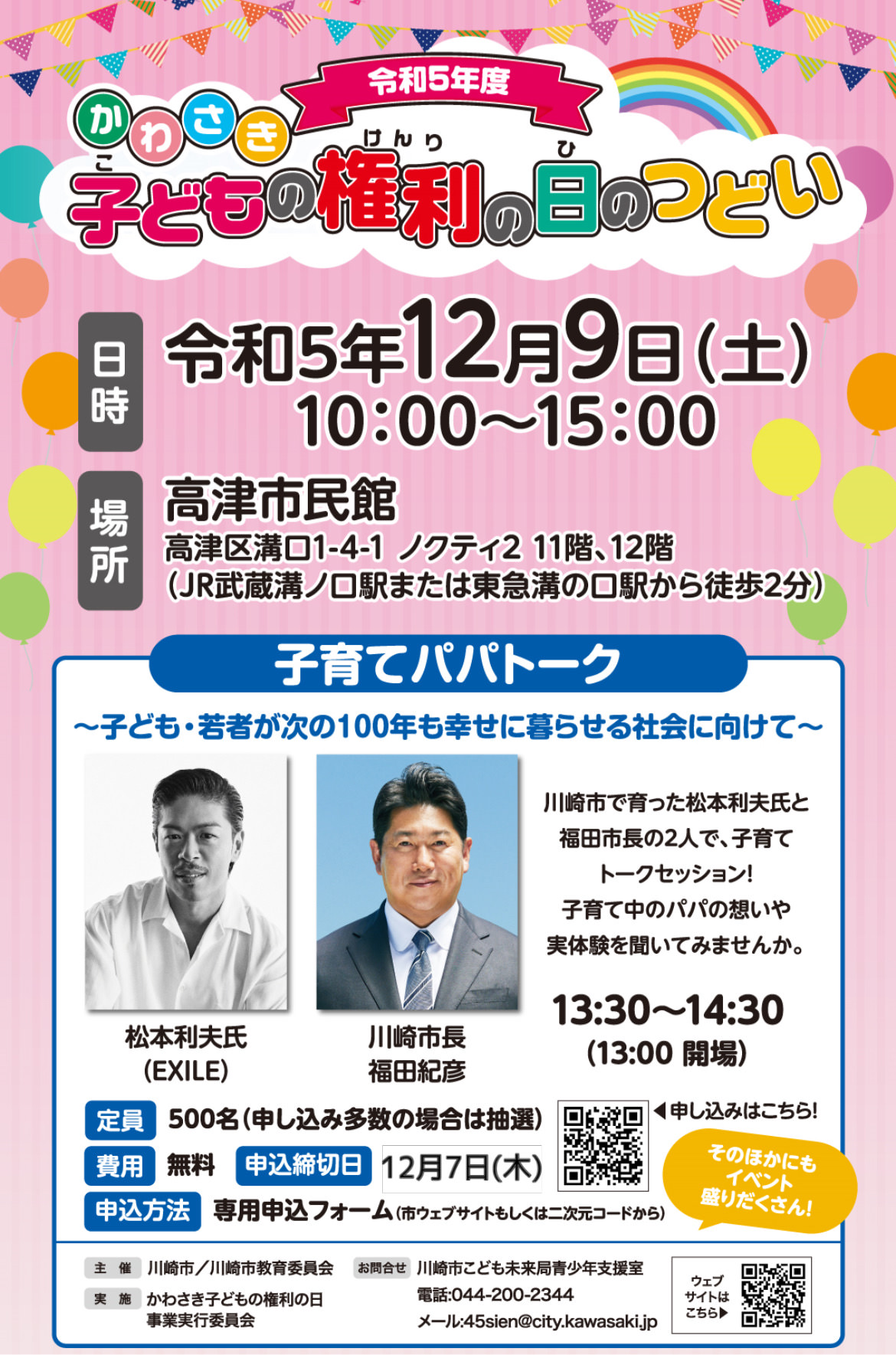 主催者:かわさき子どもの権利の日事業実行委員会、川崎市、川崎市教育委員会 開催日: 2023年12月09日 時 間:13:30~14:30(子育てパパトークの開場は13:00) 場 所:高津市民館(高津区溝口1-4-1 ノクティ2 11階、12階)