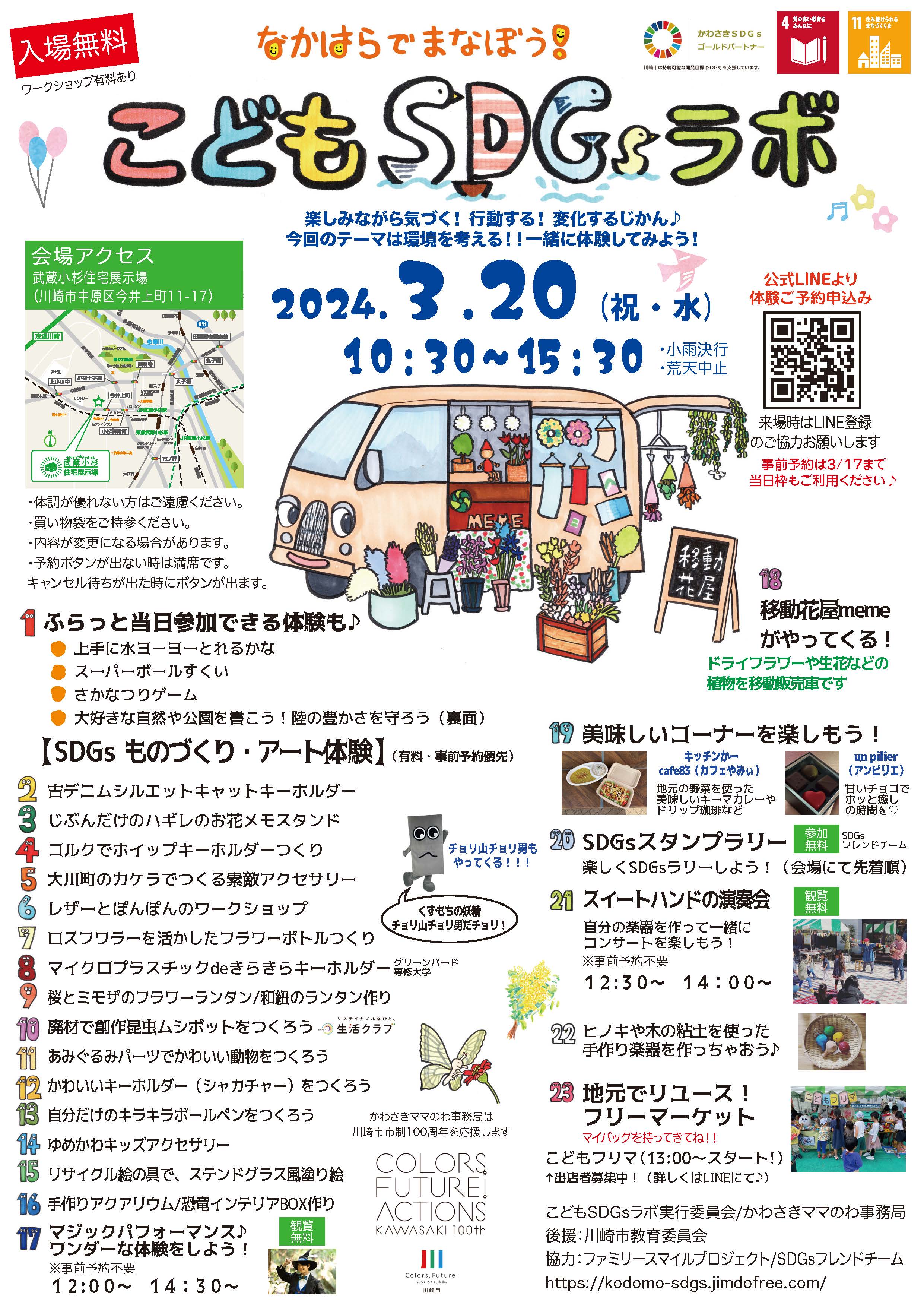 主催者:こどもSDGsラボ実行委員会、かわさきママのわ事務局 開催日: 2024年03月20日 時 間:10:30〜15:30 場 所:武蔵小杉住宅展示場 (川崎市中原区今井上町11-17)