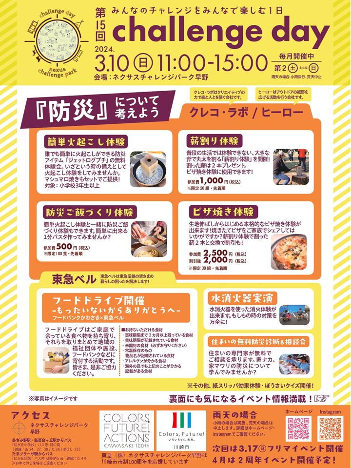 主催者:東急株式会社 ネクサスチャレンジパーク早野 開催日: 2024年03月10日 時 間:11:00~15:00 場 所:ネクサスチャレンジパーク早野(あざみ野駅・新百合ヶ丘駅からバス「虹が丘小学校」停留所 目の前)