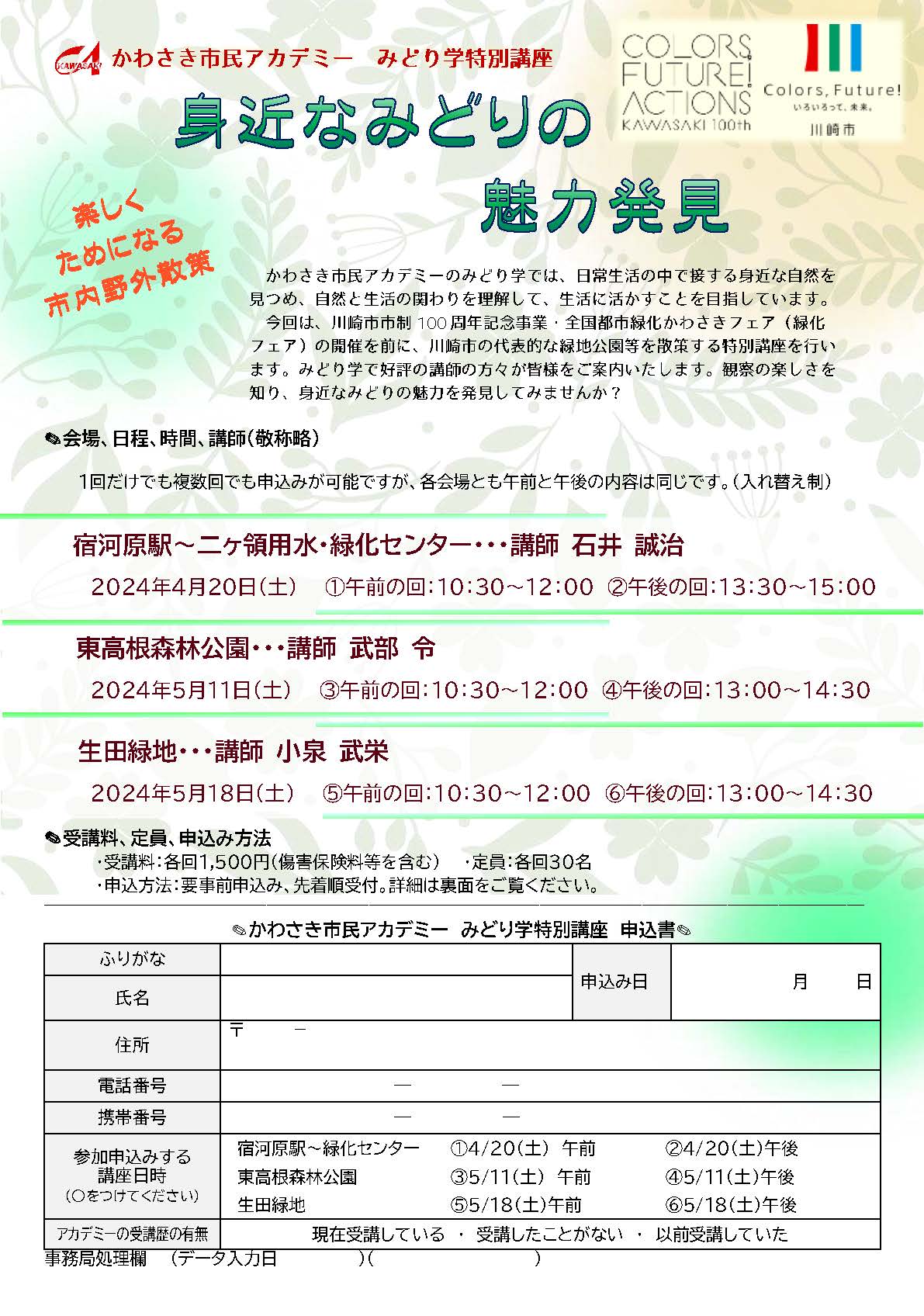主催者:特定非営利活動法人かわさき市民アカデミー 開催日: 2024年04月20日 〜 2024年05月18日 時 間:10:30~12:00 13:30~14:30 場 所:・宿河原~二ヶ領用水・緑化センター ・東高根森林公園 ・生田緑地