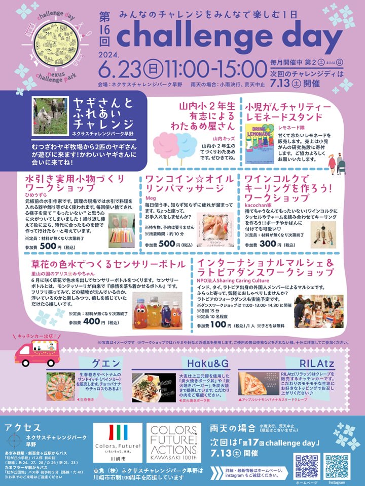 主催者:東急株式会社 ネクサスチャレンジパーク早野 開催日: 2024年06月23日 時 間:11:00~15:00 場 所:ネクサスチャレンジパーク早野(あざみ野駅・新百合ヶ丘駅からバス「虹が丘小学校」停留所 目の前)