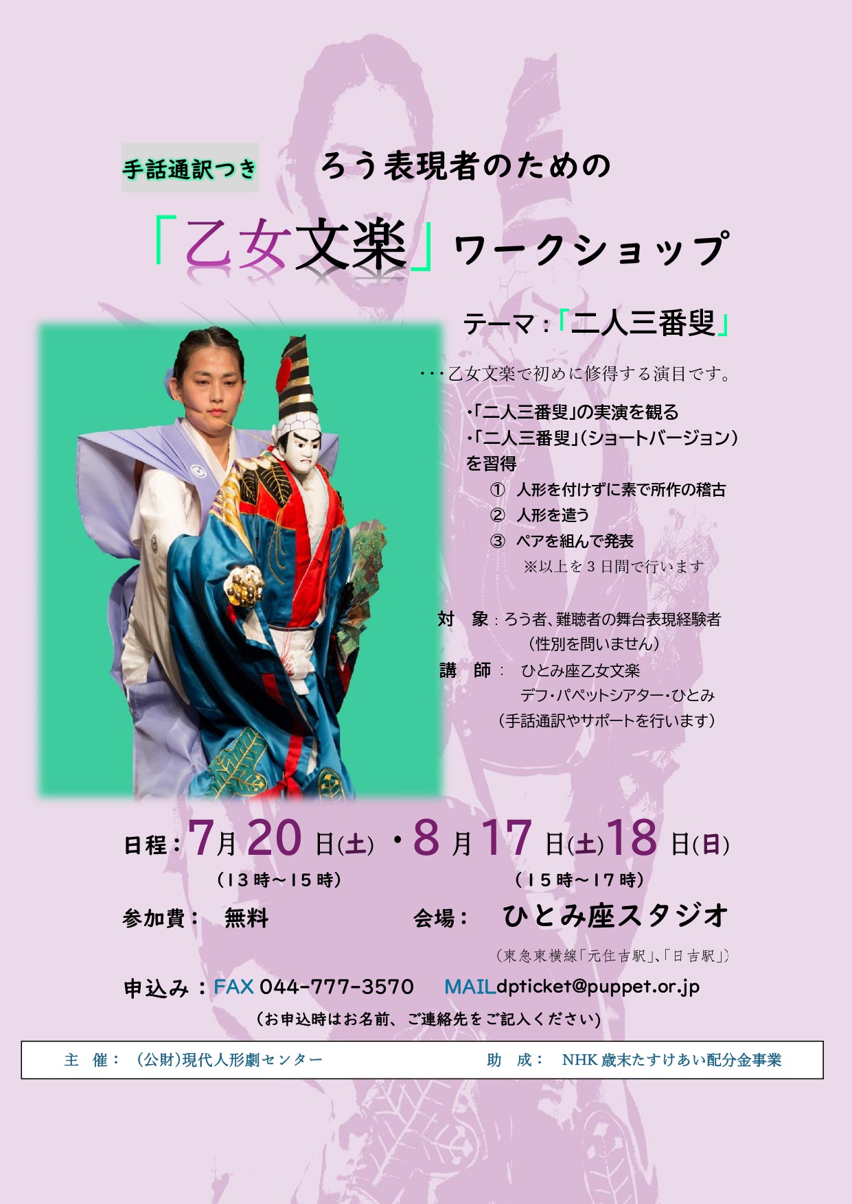 主催者:公益財団法人現代人形劇センター 開催日: 2024年07月20日 時 間:13:00~15:00 場 所:ひとみ座スタジオ(川崎市中原区井田3-10-31)