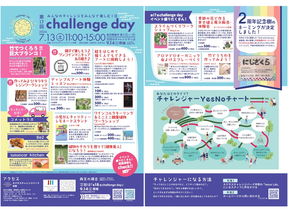 主催者:東急株式会社 ネクサスチャレンジパーク早野 開催日: 2024年07月13日 時 間:11:00~15:00 場 所:ネクサスチャレンジパーク早野(あざみ野駅・新百合ヶ丘駅からバス「虹が丘小学校」停留所 目の前)