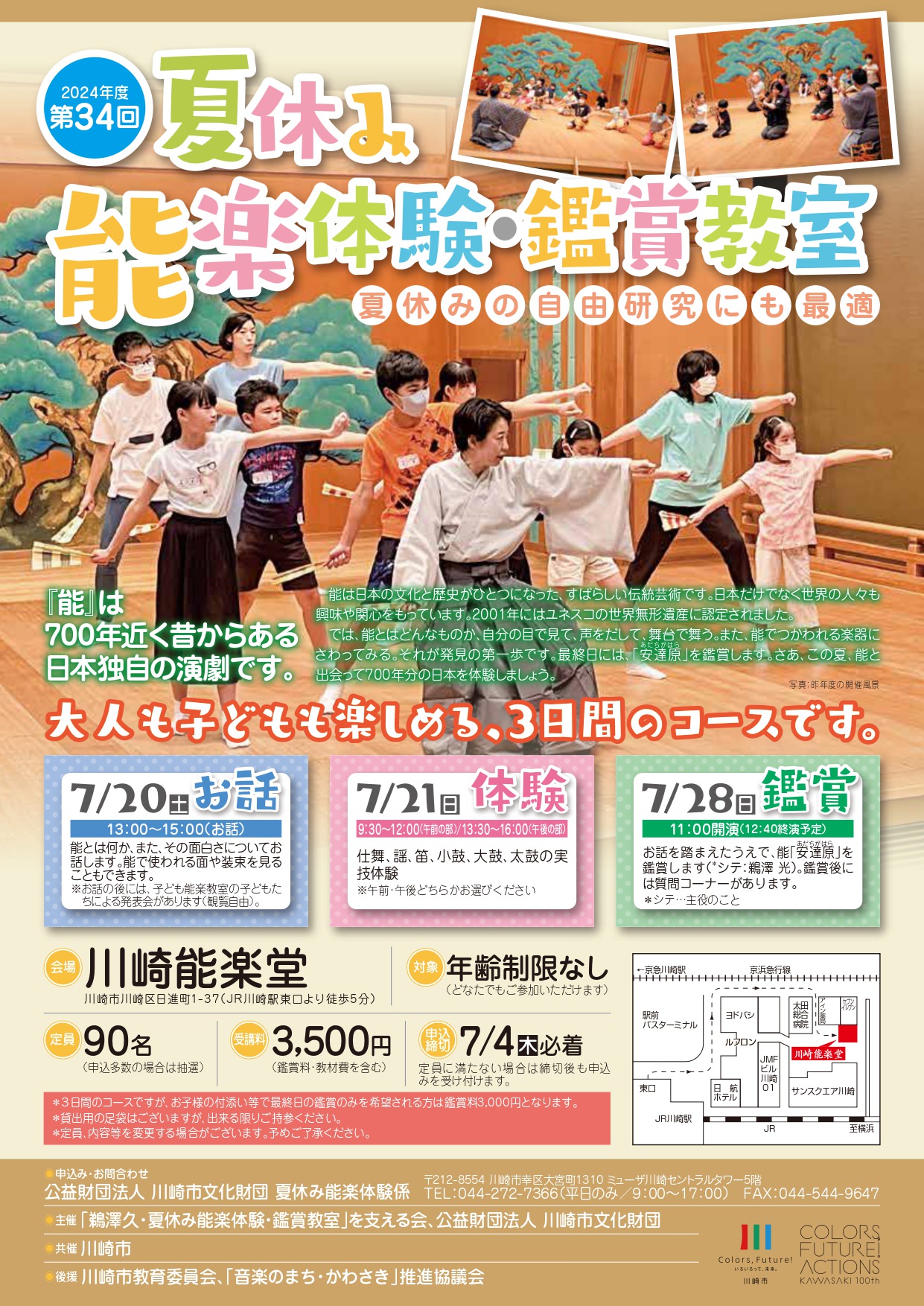 主催者:公益財団法人川崎市文化財団 開催日: 2024年07月28日 時 間:【1日目】13:00〜15:00 【2日目】午前の部(9:30〜12:00)、午後の部(13:30〜16:00) ※午前か午後のどちらか選択してください。 【3日目】11:00開演(12:40終演予定) 場 所:川崎能楽堂